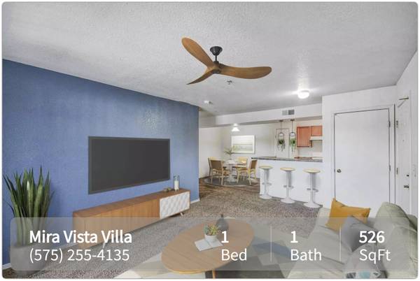 Mira Vista Villas is located in Las Cruces and offers 1-bedroom apartment homes. Our age-restricted community provides a peaceful environment, tailored for older adults. Want amenities close by? The on-site facilities let you socialize, stay active, or just relax without leaving home. Need access to shops and services? Grocery, dining, and retail options are within a short distance.