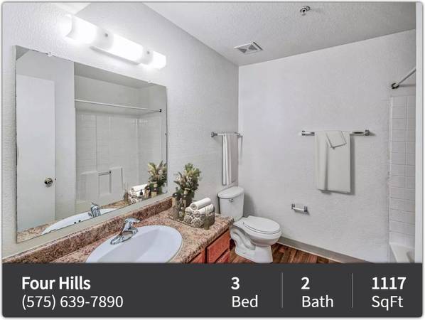 Four Hills is perfectly situated in Las Cruces, New Mexico where you are only minutes away from everything you need and love to enjoy, including admirable schools, unique shopping, great dining, and convenient commuter highways. Choose from one of our spacious two bedroom/two bath or three bedroom/two bath apartment homes. Each floor plan has well thought out interiors that make living at Four Hills that much more enjoyable. Included in our apartment homes are an all electric kitchen, spacious pantry, efficient dishwasher, washer/dryer hook-ups, large walk-in-closets, additional storage, air conditioning, and so much more. We strive to provide you with all the conveniences you desire in luxurious apartment home living!