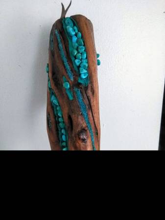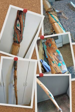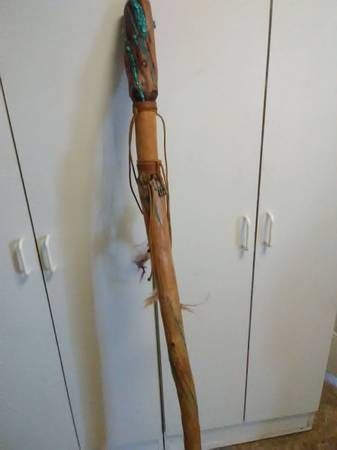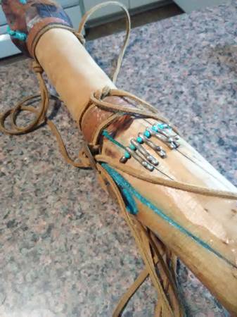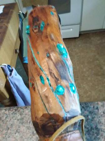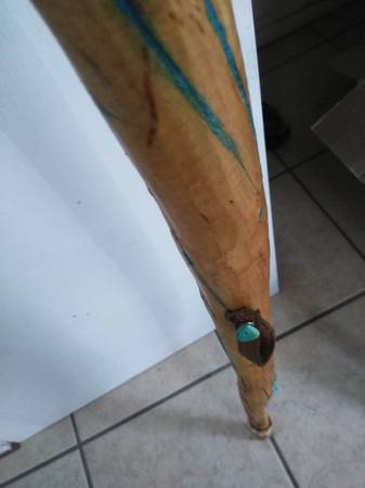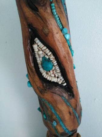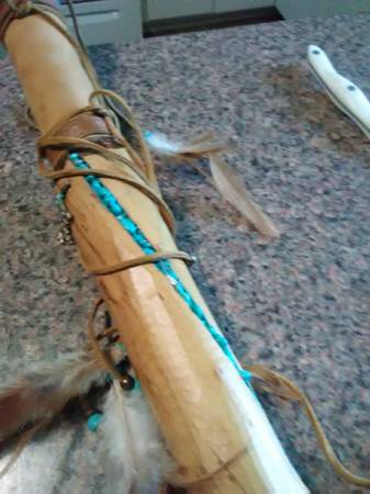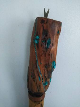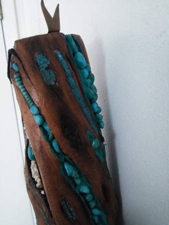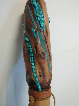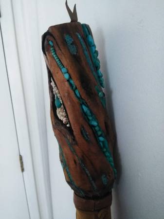 Real wood, FEATHERS, old school TURQUOISE stones and dust and a CONCH. Use it or hang it as a SHOWPIECE i designed this to be either used or hang it as a SHOWPIECE. Worth 300?? You bet it's is. Beautiful piece. Contact Mike at the phone or just email me, if you're interested. Lowballers stay away. Mike at phone listed or whatever.