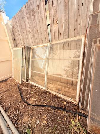 Old antique windows and sliding door. Some of the window’s glasses are broken from when it was being removed as shown in the pictures. Frame is still very solid. Slide door height is 6ft 8in, width 8ft. Windows 4ft by 8ft (1 window), 3ft by 6ft (3 windows), 3ft by 4ft (1 window), 3ft by 2ft (3 windows). Total of 8 windows and 1 slide door. Make an offer, serious buyers only.