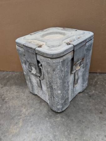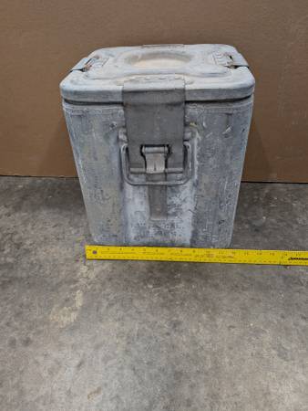 This box measures 12x12x14 and originally held 36 rounds of antiaircraft ammunition. It’s made of properly galvanized steel and has only minor rusting in some small areas. It looks like someone tried to paint it at some point, but paint doesn’t stick to galvanized steel very well so some of the original markings are beginning to show through. The latches are slightly bent but all close properly and stay closed. The gasket is as stiff as one would expect from 80+ year old rubber. There are a few small dents around the bottom corners. It weighs around 25 pounds.
