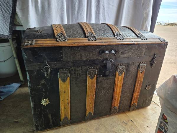 Late 19th Century Victorian Dome Back Steamer Trunk. Latches close properly, working wheels under foundation.