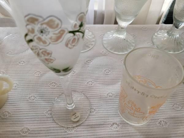 This is a gorgeous box of goodies, including vintage Coca-Cola glasses, classic soda fountain glasses, crystal wine glasses, Anchor Hocking pieces and numerous other collectible items from the previous century.