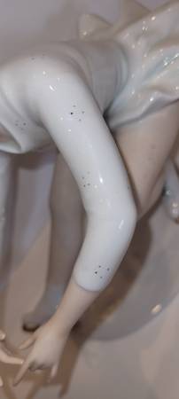 This exquisite porcelain figurine, titled “Eiskunstläuferin,” was designed in 1953 by esteemed German sculptor Kurt Steiner. Crafted by Wallendorf, one of Germany's oldest porcelain manufacturers, the piece showcases a graceful female figure skater in mid-performance. Hand-painted with delicate green accents and gold-toned skate blades, the figurine combines matte and glazed finishes to highlight its intricate details. Marked with the green underglaze crown over “W” and “1764,” and impressed with model number 1438 and “Steiner” on the base, this collectible stands approximately 25.5 cm tall. A fine example of mid-century German porcelain artistry, perfect for collectors and enthusiasts alike.
