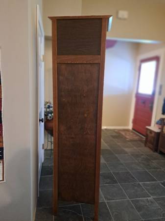 We've had this wonderful clock for around 40 years. It keeps good time and the chime works great. Chimes on the hour and half-hour. We don't know the age or the maker - the rear movement cover, which probably had that information, was replaced with a piece of particle board before we bought it. The clock measures 75.5" tall, 21" wide (at the top), and 14.5" deep (at the top). There is a small discoloration on the left side of the case.
