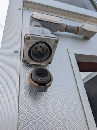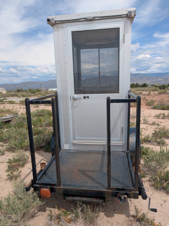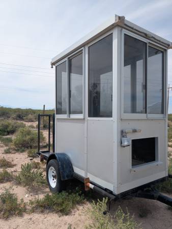 Porta-King guard shack is 49" x 75" x 82". The space for an AC is 26" x 15 1/2", the trainer has a pintle hitch (doughnut) and is 50 1/2" x 118." Can be ran using 220v twist lock plug from shore...