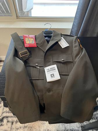 To my knowledge this is all the components of a New US Army Pinks and Greens Full Dress Uniform: Coat Altered 40S with ROTC Patches, Pants Altered 37S, New Shoes 10.5, New Male 15 32/33 Long Sleeve Shirt, New 7 1/8 Garrison Cap, New Short Necktie, New Belt Buckle, New Small Socks, New 39” Belt. $295 or best offer. Jacket and pants were altered but never worn. All components still have tags from clothing sales. I lost the receipt, hopefully this can bless someone looking to not spend 500+ on base. If you need just one component that I have message me.