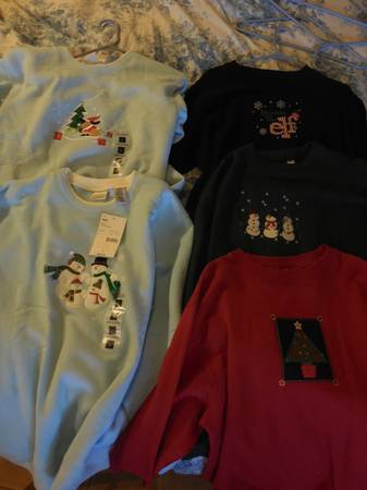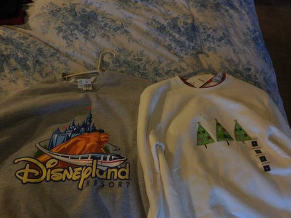 All are $6 each and brand new, or $5 ea if you buy 2 or more. The 5 in the first photo are size L The the 2nd photo is size M and the Disneyland is sold. The single black elf sweatshirt is XL