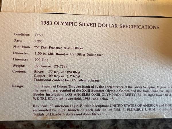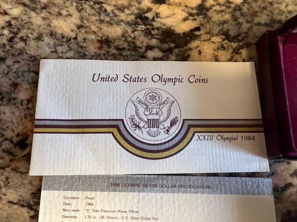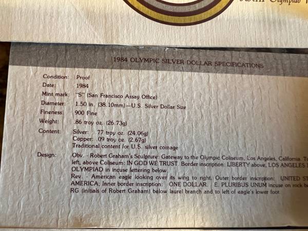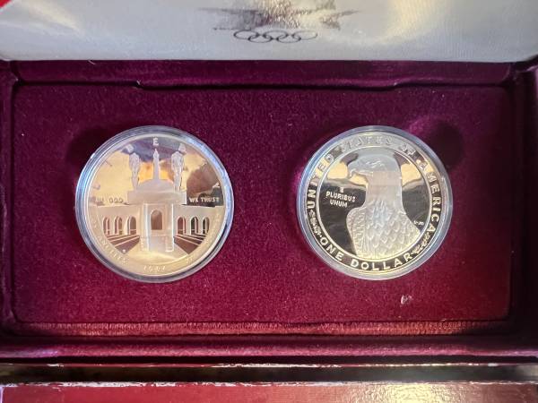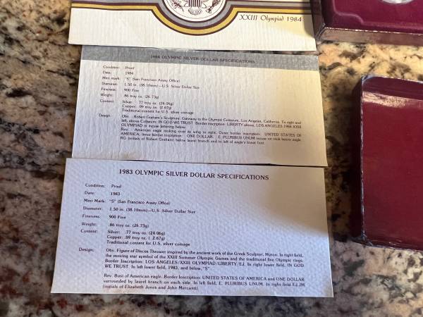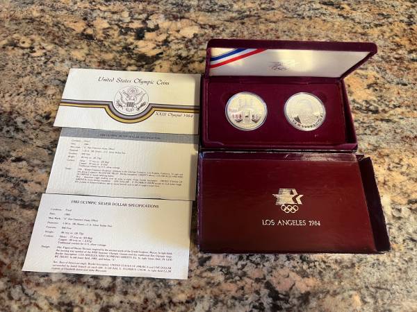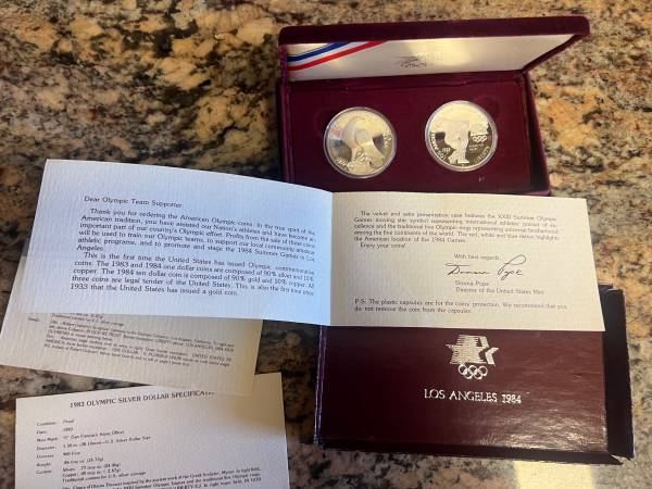 Set of 2 US Minted silver dollars from the 1983 1984 Olympics 90% fine silver With COA $120 for both Las Cruces