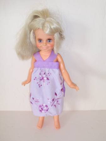 The first doll is a 1960's Crissy growing hair doll with sleep eyes. It has fully functional sleep eyes, arms and legs. Molded plastic head that moves. It's missing turn knob for hair but can be done manually. Her hair is cut with two factory lengths. Her hair grows and goes into her head. She is 16" tall and comes with her stand. She is very fresh and clean and lovely for a 50 year-old doll. She is an Ideal Velvet doll from the Crissy family. Ebay sells her for up to $75. She's only $20, cash only. She does not come with her original clothing. Call or text 832-454-2two14 if interested in purchasing this collectible doll. Phone number is from Houston but I'm retired in Las Cruces. CONSIDER IT AVAILABLE UNTIL POST IS DELETED.