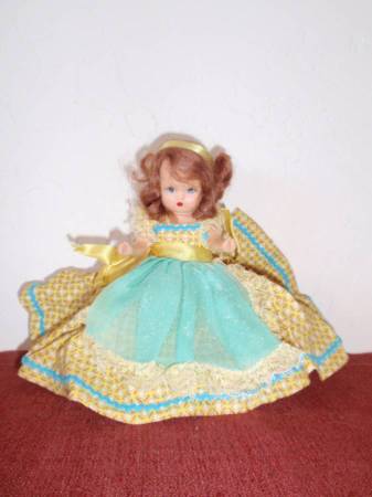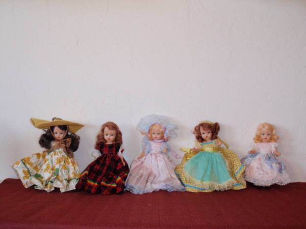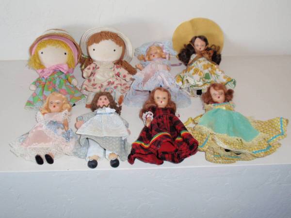 Start a collection of these wonderful vintage dolls for your little one. This post contains the Nancy Ann Story Book dolls, one Holly Hobby clothespin doll, and two Joan Walsh dolls. The Nancy Ann Story Book dolls are all marked on their backs with "Story Book Doll, USA". They are made of hard plastic. Hard plastic dolls were introduced in the late 1940's when new plastics were developed during WWII. Each doll has sleepy eyes that open and close and arms that move. Their feet are flat so they will stand up alone. They are 6" tall and wear their original clothing. All are in good condition. These dolls have been stored so their dresses could use some attention to get them fluffed again. The clothespin doll is a Holly Hobby jointed 6" wooden doll. It's got a hand painted face and wearing a handmade dress. In great condition. In addition to these, there are two Joan Walsh Anglund Pocket dolls. The Joan Walsh Anglund Pocket Dolls are from the 1970's. They are in great condition with their original clothing and original manufactures' tag with the year and company name. The price for each doll is $10 and they sell for much more on etsy. Call or text 832-454-2two14 if interested in purchasing this collection of dolls. Cash only. CONSIDER THEM AVAILABLE UNTIL POST IS