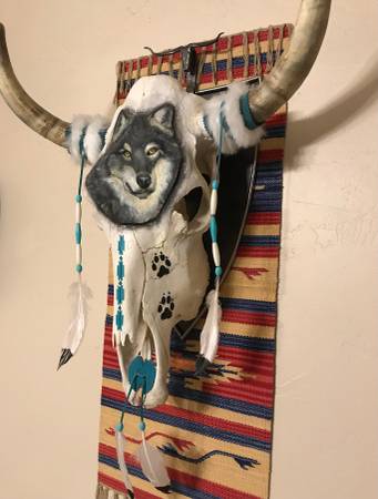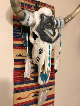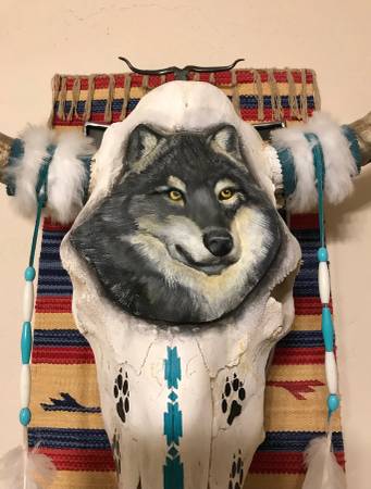 $525 … An original ... a cow skull artistically transformed into art ... Southwestern theme ... a wolf’s head (actually a ceramic sculpture) artfully applied to the skull forehead and embellished with white fur, turquoise beads, and feathers ... masterfully crafted by an artisan who said ... “this is the only wolf-themed cow skull I ever envisioned and it was a challenge to apply the wolf profile to the skull” ... this is a commissioned piece, probably never replicated ... overall size: horns tip-to-tip measures approximately 20” and the actual skull is about 20” high and 10” wide.