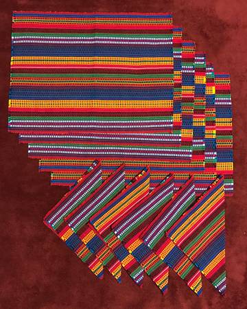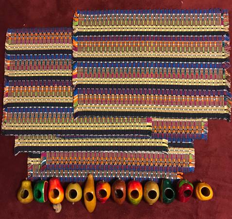 Hand woven placemats ... 1) set of 6 large placemats, 14” wide by 19” long ... 2) plus a set of 6 smaller mats 12” wide by 16” long with 6 napkins of 8” x 8” ... included are 12 hand carved napkin holder rings in the shape of tropical fruits. Placemats are on intense colors, all hand woven in Guatemala, City of Chichicastenengo. None were ever used ... brand new, no stains, no blemishes, elegant on any table setting.