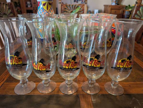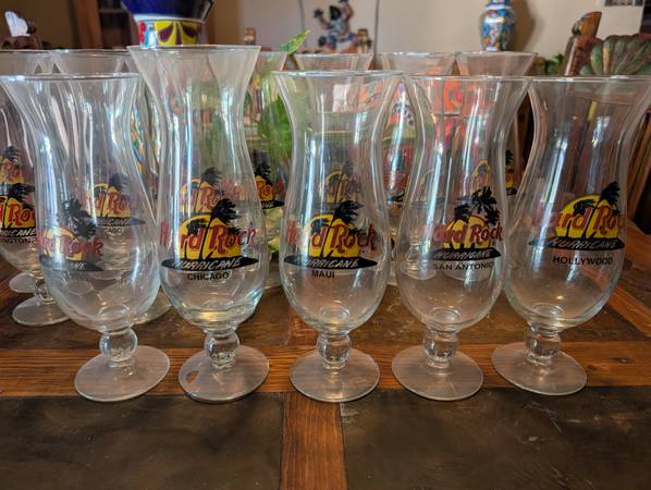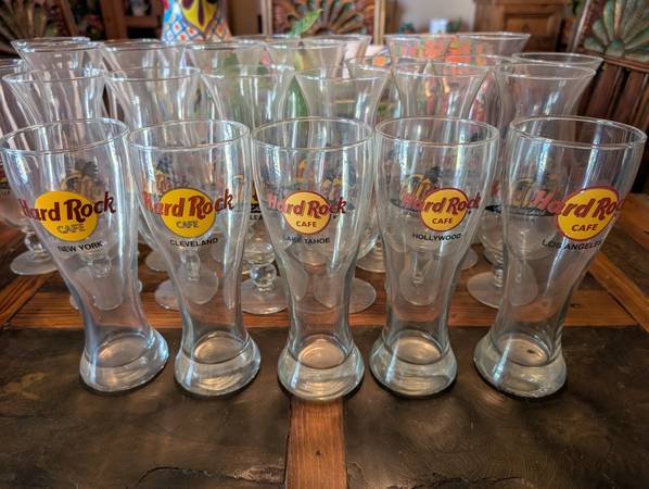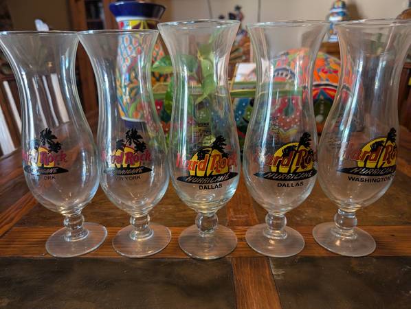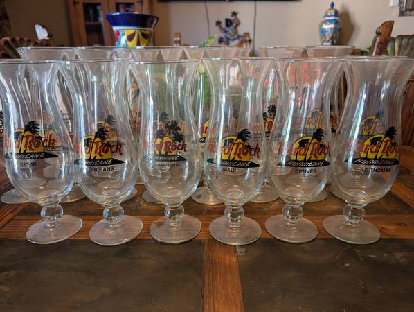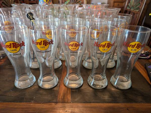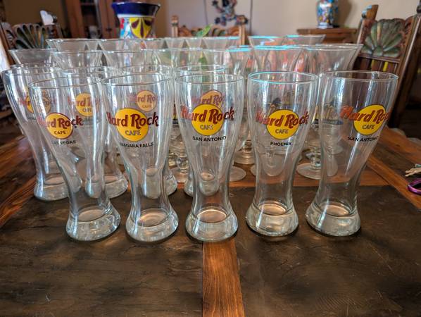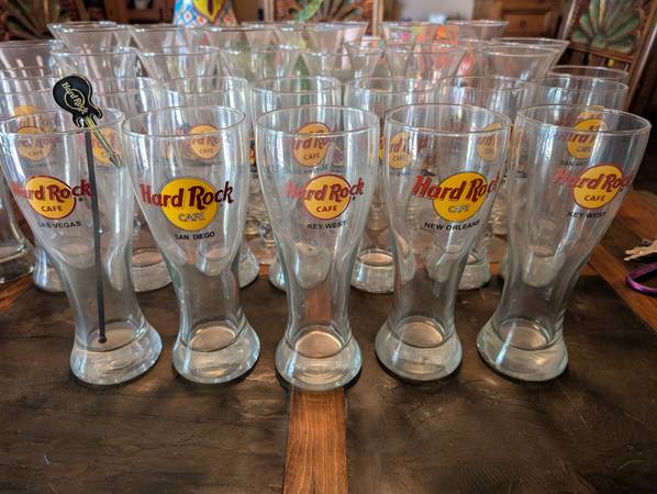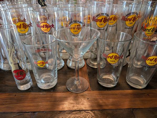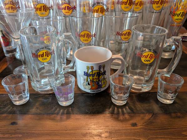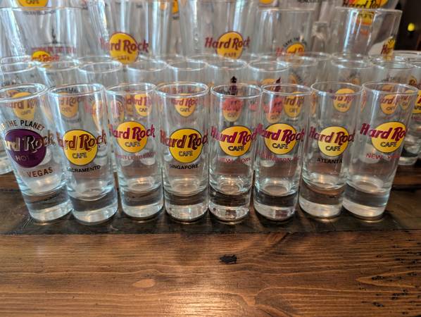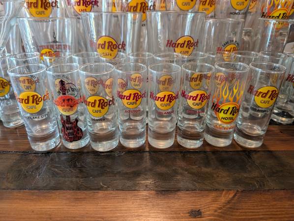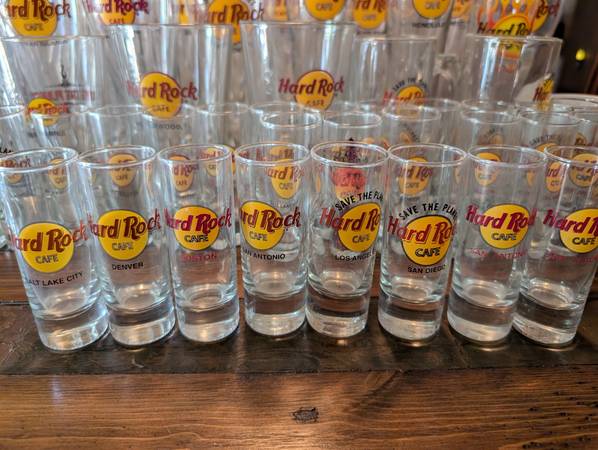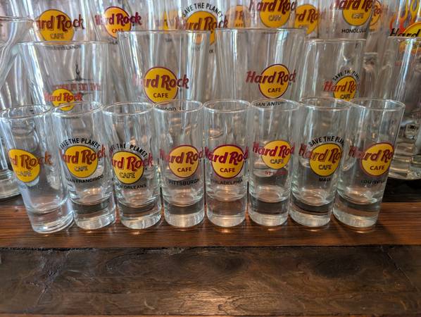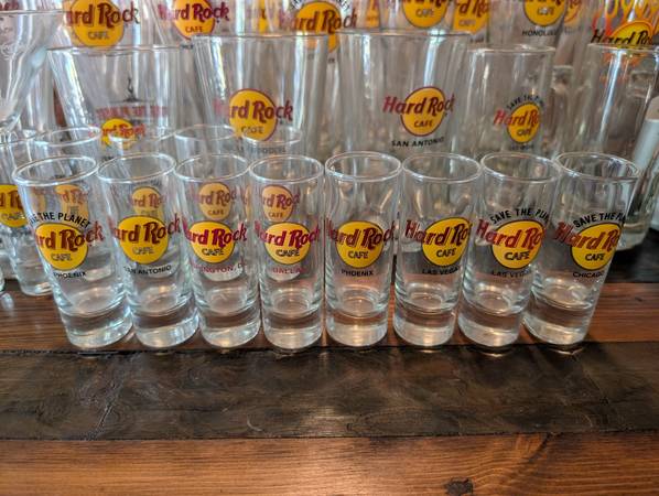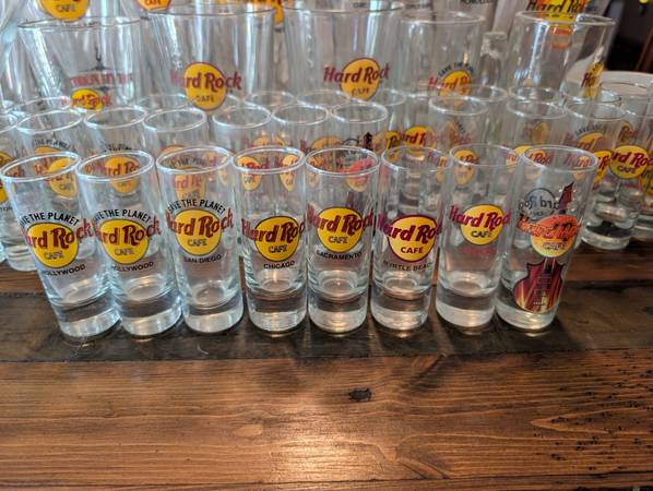 For Sale: Huge Collection of Hard Rock Cafe Glasses. There are over 50 Shot glasses, several Pilsner and Hurricane glasses, plus a couple Mugs. Asking $180 for all of them. There are over 100 glasses total. Please call or text me at show contact info