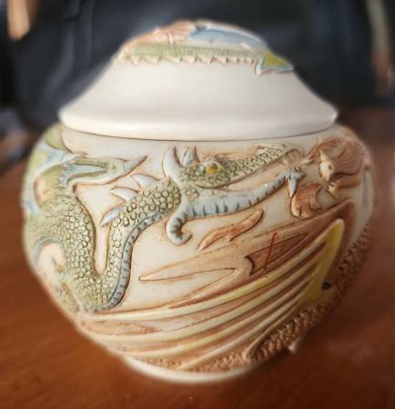 The Mixed Magic keepsake cremation urn is crafted using a special crushed marble resin, pioneered in the English Cotswolds. Carved with graceful bas-relief dragon designs, this elegant and imaginative cachepot has a warm ivory look and feel. Every piece is hand-tinted, lending each urn its distinctive character