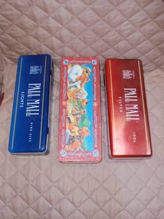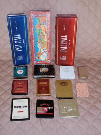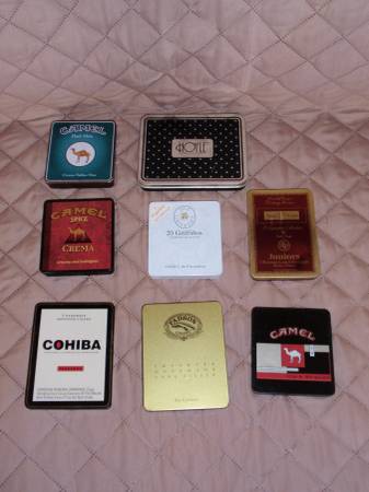 This is a collection of tin cigarette containers - some are much older than others. The price is for all the collection. This is a good way to start or add to your collections. Call or text 832-454-2two14 if interested in this collection of cigarette containers. Cash only. CONSIDER THEM AVAILABLE UNTIL POST IS DELETED.