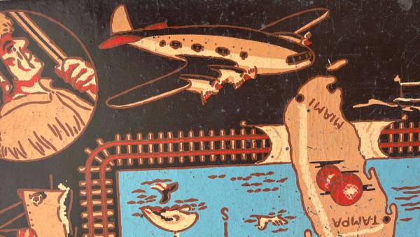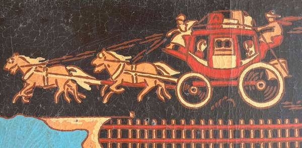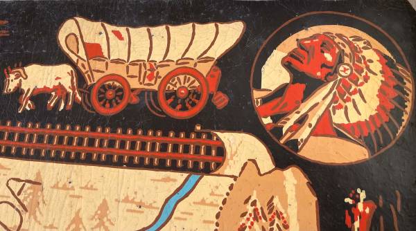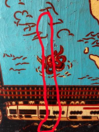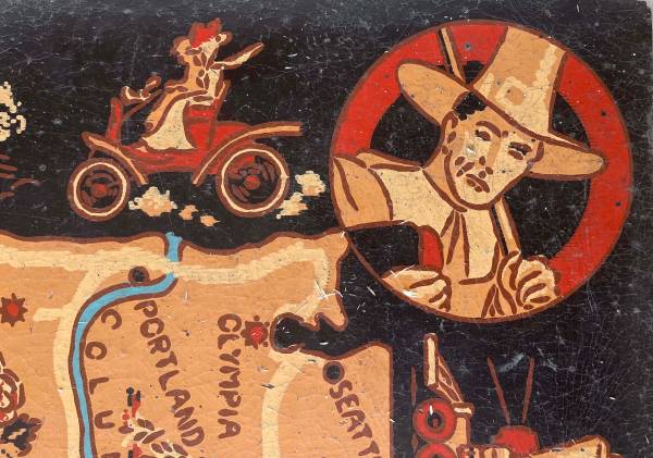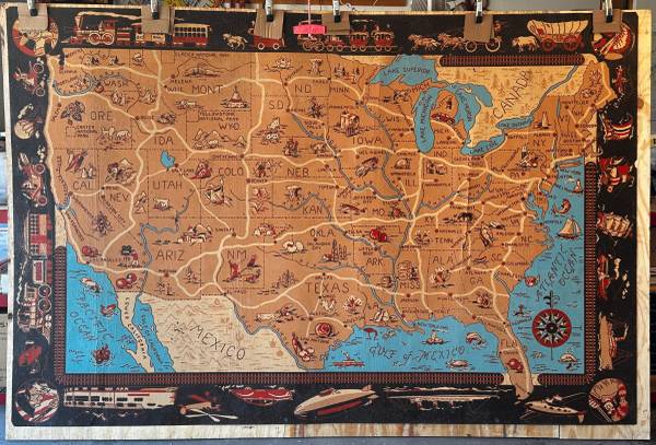 This 6x9-foot map of the US was produced by the Armstrong Linoleum Company in 1940. It has been used by three generations in our family but we no longer have a place for it. The black border depicts the development of transportation in the US from horseback to streamlined trains of the 1930s and early passenger aircraft. The attached photos depict the overall map and some of the details. The map has some cracks (see red circled areas in photos), but is intact. One corner piece has been mended. The map is flexible enough to be transported in a van or pickup, but it is brittle and needs to be handled with some care. If you are interested, it's available for inspection at our home. While these maps have sold at auction for several hundred dollars, our interest is finding a use where it can be appreciated.