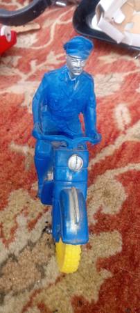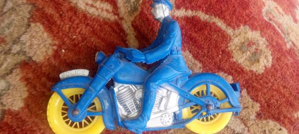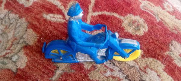 $25 excellent condition This vintage 1950's Auburn Rubber Police Officer on Motorcycle toy is a unique collectible piece. Made in the United States, this 6" toy features a police officer riding a motorcycle in blue, adding to its nostalgic charm. With its retro design and classic play value, this toy is sure to be a standout addition to any vintage