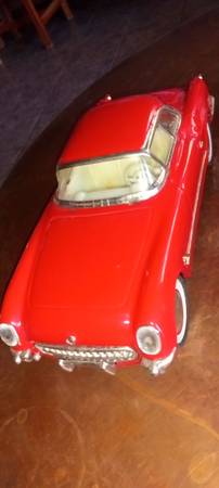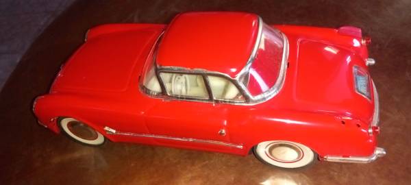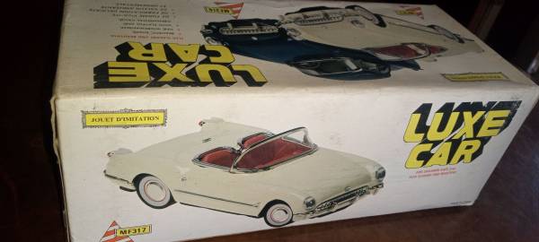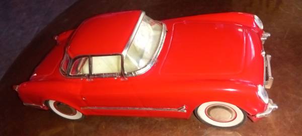$30 BOX The product is a vintage 1953 Chevrolet Corvette sheet metal car toy in 1/18 scale, manufactured in China for $30. This diecast collectible features a red color with a detailed design of the iconic Chevrolet Corvette model from 1953. The car toy is part of a contemporary manufacture of cars and trucks, specifically catering to car enthusiasts and collectors who appreciate vintage vehicles. Made of sheet metal and plastic, this model captures the essence of the classic Chevrolet Corvette in a smaller scale for display or play.