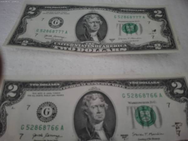 This is a set of 43 two dollar bills, all legal currency. Many of them are IN SEQUENCE numbers! The bills' serial numbers range from 701 to 781. There is one bill ending with serial number 777, and, since Chicago is the #7 federal reserve bank, this means that this bill has SEVEN 7's printed on the face of it! Lucky sevens!