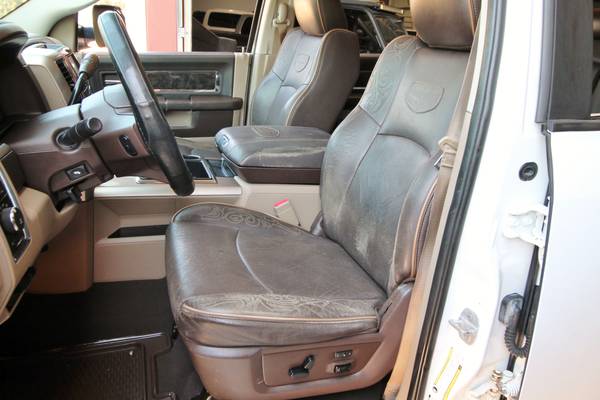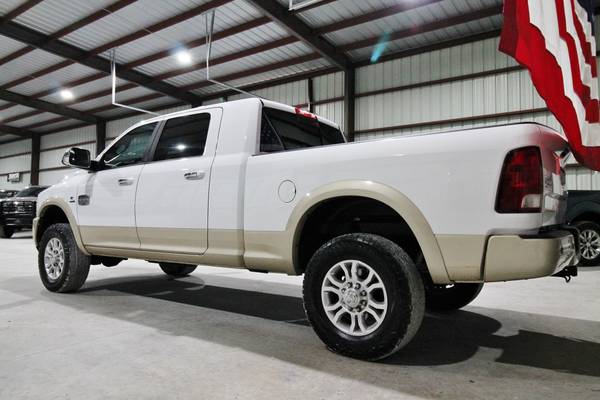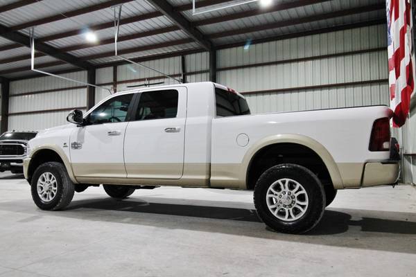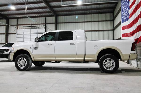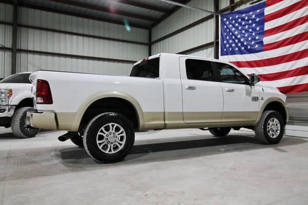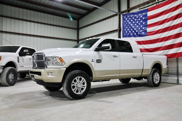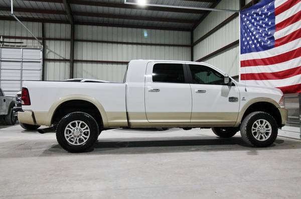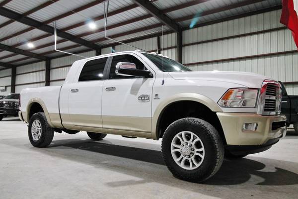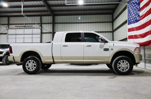 For sale is a clean and well-maintained 2012 RAM 2500 Laramie Longhorn Mega Cab 4x4 powered by the 6.7L Cummins Turbo Diesel paired with an automatic transmission and electronic four-wheel drive. This Texas-owned truck has 257k miles, a clean Carfax, and an incredible 59 detailed service records reported, showing it’s been exceptionally well cared for. It’s leveled and sits on like-new Cooper all-terrain tires, with a clean and straight body and a B&W gooseneck hitch ready for towing. Inside, the saddle leather interior is in great condition with no foul odors or smoke smells, and this truck is an ultra-rare factory NAV, roof, and rear DVD configuration. It’s fully loaded with dual power heated and cooled seats, a heated steering wheel, dual climate control, a factory touchscreen radio with navigation and backup camera, a sunroof, and rear DVD entertainment. Additional features include electronic 4x4, a built-in trailer brake, power windows, and power locks. This Laramie Longhorn Mega Cab is a hard-to-find, fully loaded diesel that perfectly combines capability, luxury, and dependability.