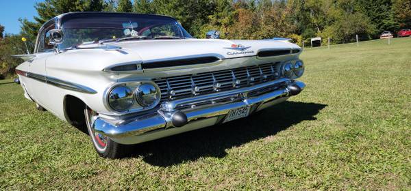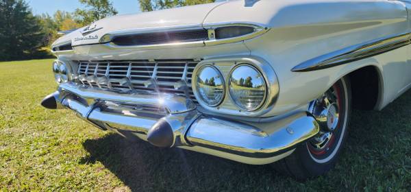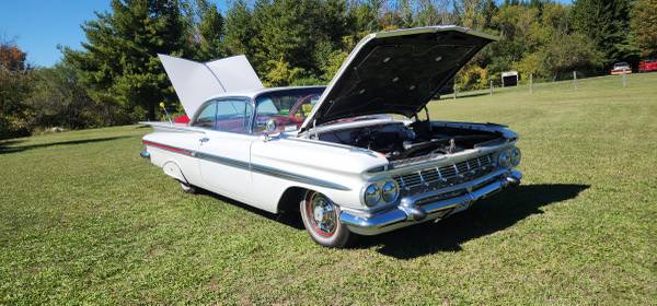 Located in Ontario canada. Super clean car. 1959 impala, 348, 2spd powerglide. Continental kit. Restored car. Documented with service and restoration records and pictures. No rust or issues! Serious inquiries. Can help with transport door to door. Runs and drives excellent. More pics available for serious buyers! Located in Ontario Canada.