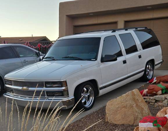1996 Chevy Suburban 1/2 Ton. 76K. Original Miles. Super Nice Wont Find Another Rare Find. . 6/8 Drop. Originally Done in 1996 at the Original Drop Shop in Southern California. C Notch, Lowered Coils, Drop Spindles, Helper Bags in Rear ,Tank and On Board Compresor and Gauges, Super Clean Leather Grey Interior, and Carpet, Original Factory Rubber Floor Mats. No Cracks on the Dash. . . Dash Cover. 50 Gal. Gas Tank, Excellent Gas Mileage, Tow Package, 18/17 inch Chrome Torque Thrust ll's, Billet Steering, Billet Antenna, Billet Grill, Smoothie Chrome Front Bumper, Smoked Tinted Front and Rear Tail Lights, Full Power Everything, Seats,Windows, Locks, CD Player, Duall A/C Blows Cold and Ceramic Tint all Around, Clam Shell Rear. A Couple of Little Door Dings and a Couple of Small Dents. . Reduced $7,000 For Quick Sale. Clean Title. Original CaliforniaTruck. I Have Original Center Council and a Custom Council with T.V. and VCR that Was Purchased New From Traders Back in the Day" " $13,500 " "FIRM. .
