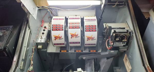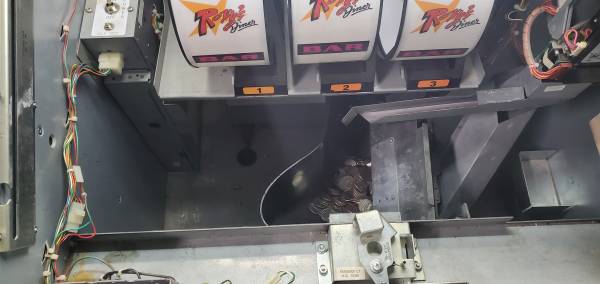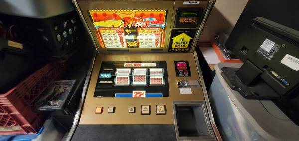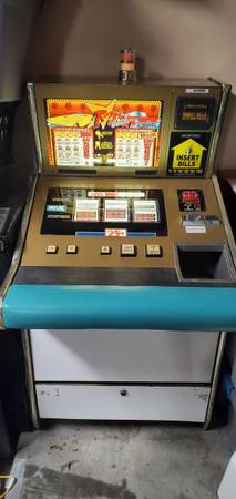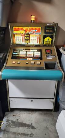 Full size sit down slot machine light up but has rom error great for game room or garage or mancave