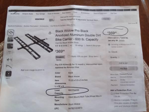 Black widow pro black anodized aluminum double bike carrier. 600 lb. Capacity. Like new, only used 3 times! Purchased for 369.00 new!