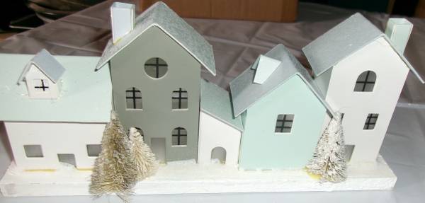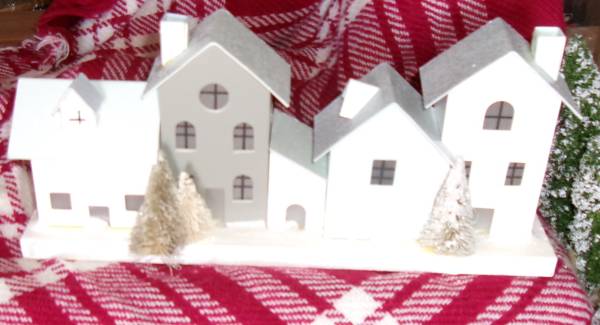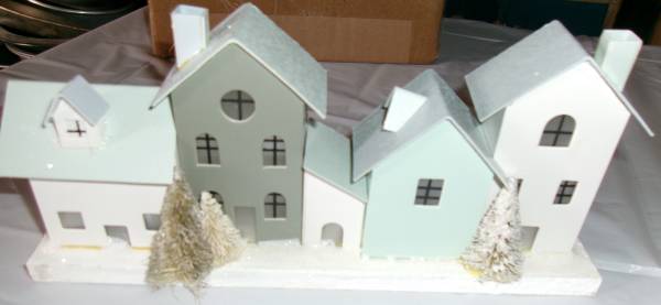 Charming decorative winter village scene with houses and trees. Tag still attached and boxed. Lightweight. (2 available). 4.5" Tall x 10" Long. Price is $12 ea. - CASH, please. I have some extra miniature trees for sale too! Check out my other listings!