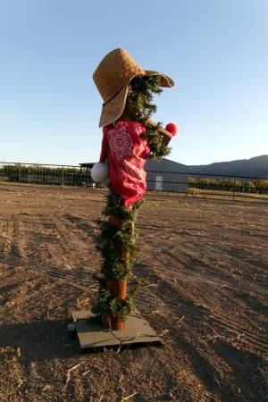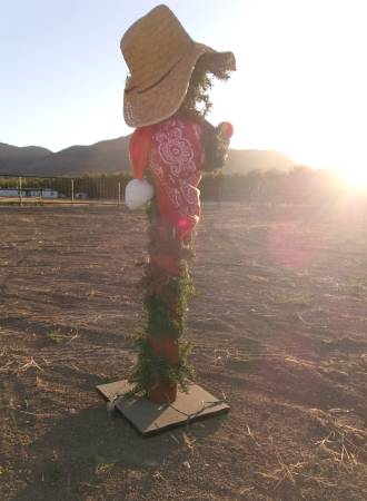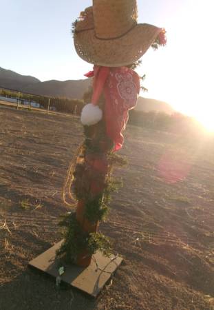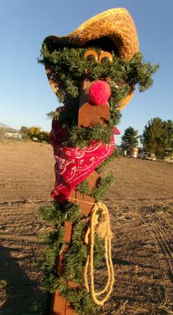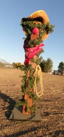 Holiday Wooden Post Cowboy Reindeer with hat, bandana, rope, string lights-mounted on stand. Over 4' tall. $40 CASH, please.