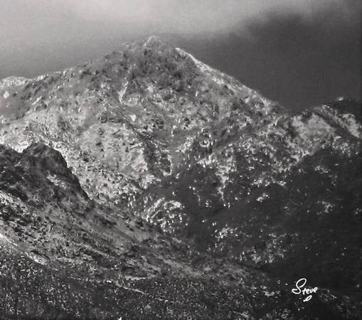 Panoramic black and white photograph of the Organ Mountains by New Mexico photographer Steve Gollery, signed at lower right. Gollery, captures the dramatic spires of this iconic range dusted with snow beneath a moody desert sky. His work reflects a keen eye for tonal contrast and natural light, emphasizing the rugged textures and commanding presence of the Southwest landscape.