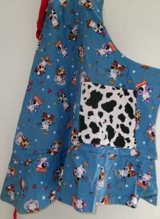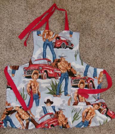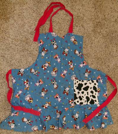 Adult Size Cotton Handmade DOUBLE SIDED Apron. Side 1: Western Cows Side 2: Sexy Cowboys! Each side has a large coordinating pocket. Adjustable neck strap. (Should be gently washed). $25 Cash, please.