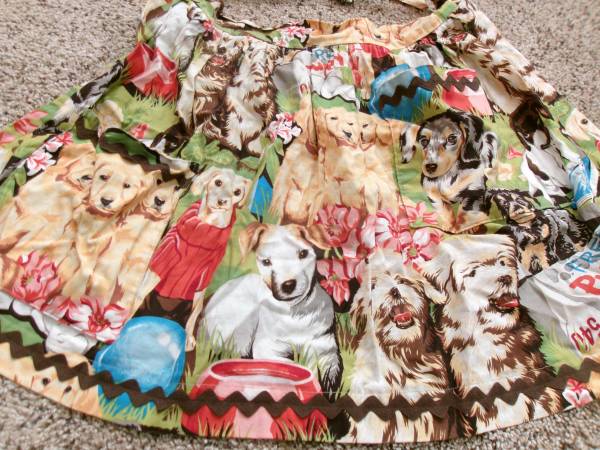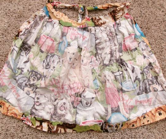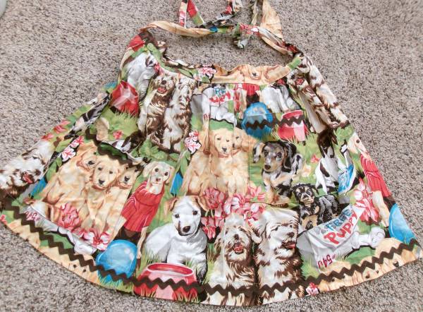 Adult Size Cotton Handmade Apron featuring an assortment of sweet doggies of all sizes. Apron is accented with brickabrack trim and has 2 large deep pockets. (Should be gently washed). $12 CASH, please.
