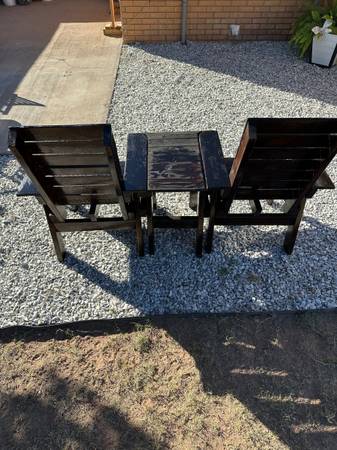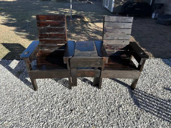 Real nice, heavy duty three-piece set, chairs have cupholders and a table in between. Sanded and stained with dark hickory stain. Got new furniture so don’t need these asking for 150 or best offer.