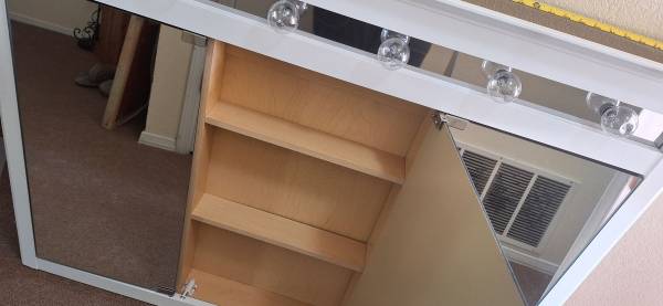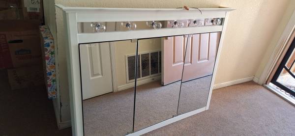 Bathroom medicine cabinet/vanity for sale good condition has small Crack in corner of mirror door ( in picture)doesn't effect door.