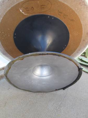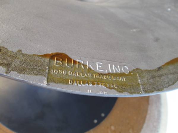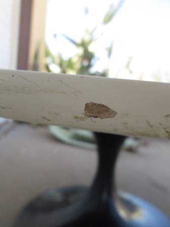 Vintage Mid Century Modern Burke Tulip Coffee / End Table with a dark blue base. The table measures approximately 35-1/2 inches in diameter and 16 inches tall. The white table top is in good condition with a few light scratches and several chips on the edges. The base has a few areas of chipped paint. The bottom of the base is marked Burke Inc. MCM