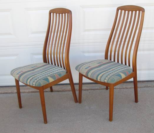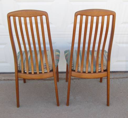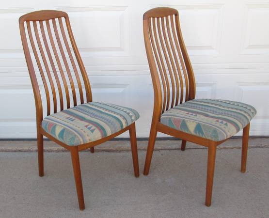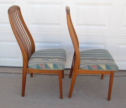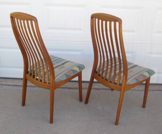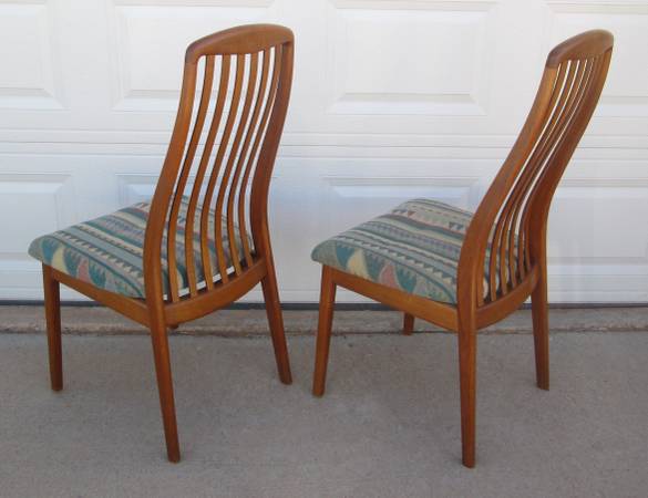 2 Vintage Danish Modern teak chairs attributed to Preben Schou. Each has a stamped mark on the underside that reads "Made in Denmark". Each chair measures approximately 39-1/2 inches tall, 20 inches wide and 23 inches deep. 17 inches to the front top of the seat and the seat is approximately 17 inches deep, 19 inches wide at the center.