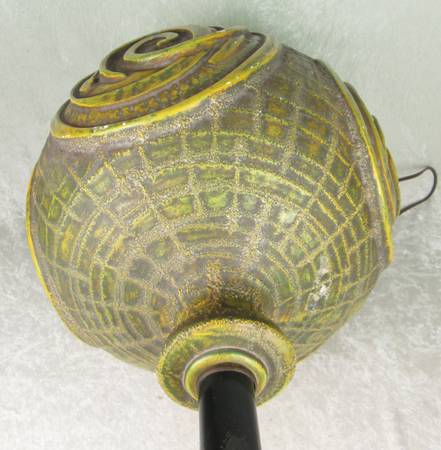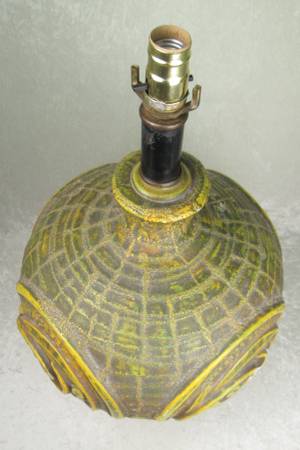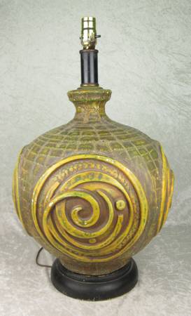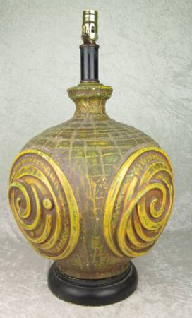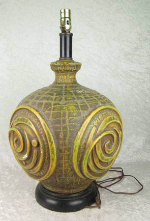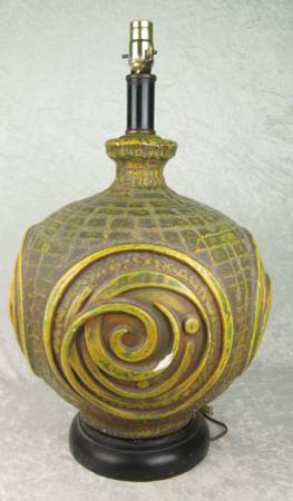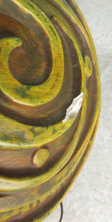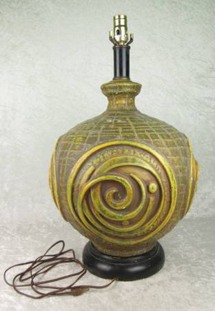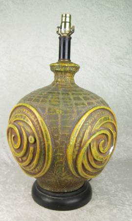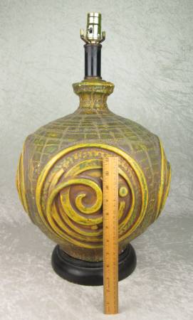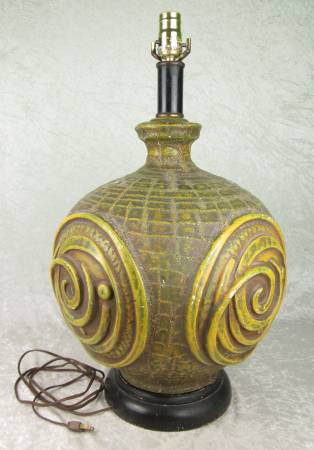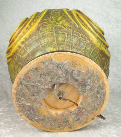Vintage Mid Century Modern Chalkware Table Lamp with wooden base. The lamp is in green and yellow with a geometric grid / net and spiral design. The lamp is approximately 23 inches square tall to the top of the socket, 18 inches tall to the top of the chalkware and 14 inches in diameter.