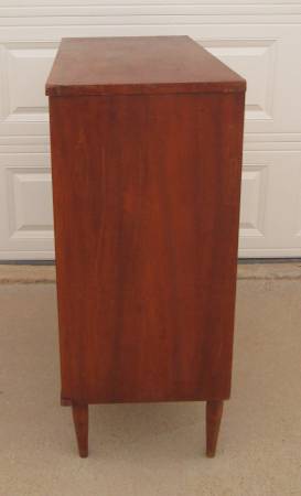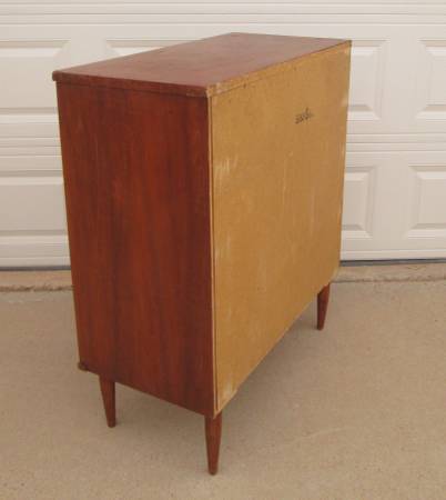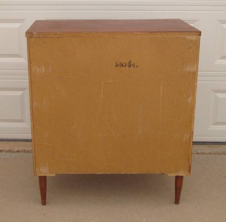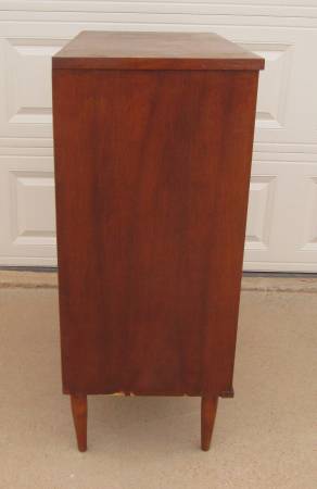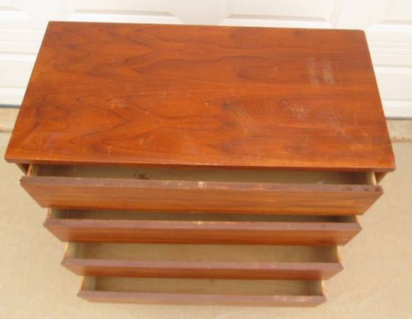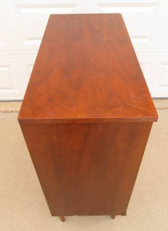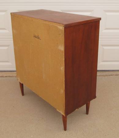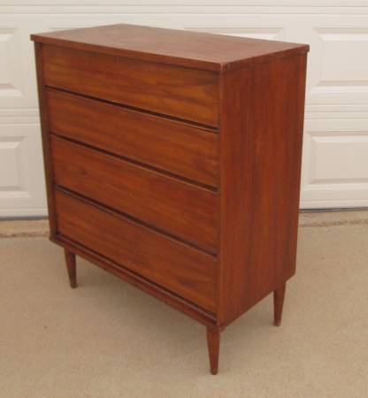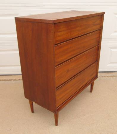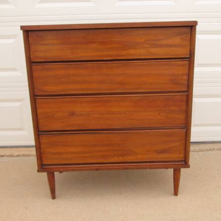 Vintage Mid Century Modern Harmony House Walnut Chest of 4 Drawers / Highboy Dresser. The chest measures approximately 41-1/2 inches tall, 35-3/4 inches wide and 17-1/2 inches deep. Cash Only