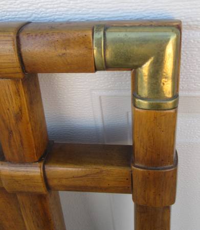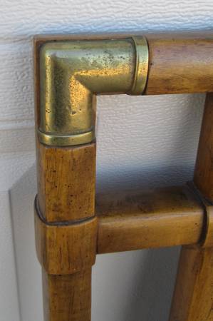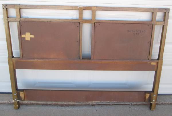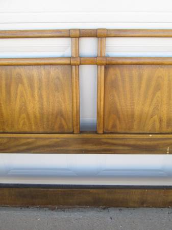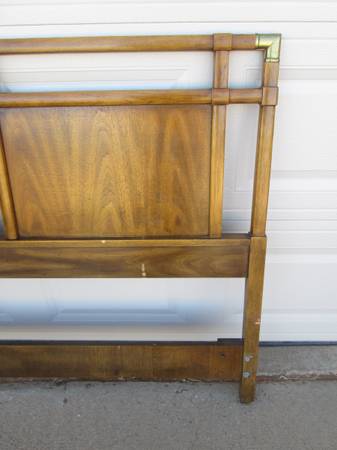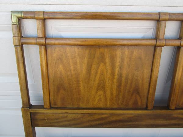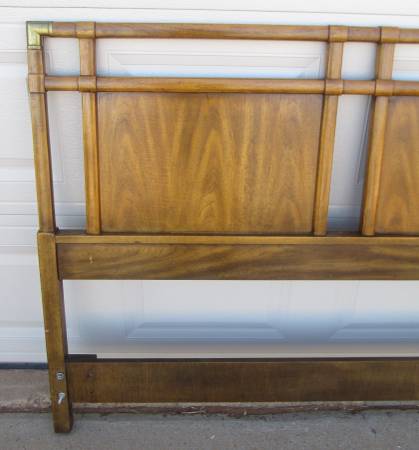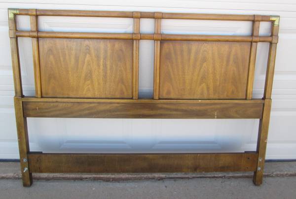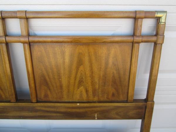 Vintage Mid Century Modern Drexel Accolade Full Size Headboard. The headboard has an Asian inspired design with brass accents. The headboard measures approximately 43-1/4 inches tall, 60 inches long...