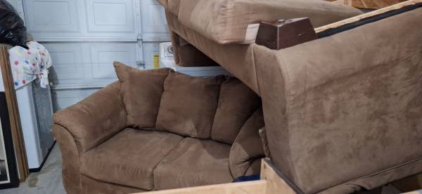 Brown sofa and love seat for sale in good condition has a couple of tiny tears from moving, have been in storage for the last year and need cleaning. 80.00 OBO