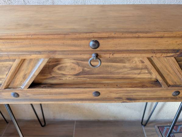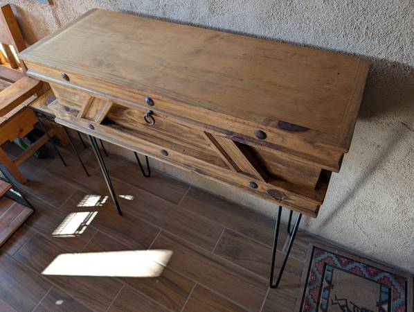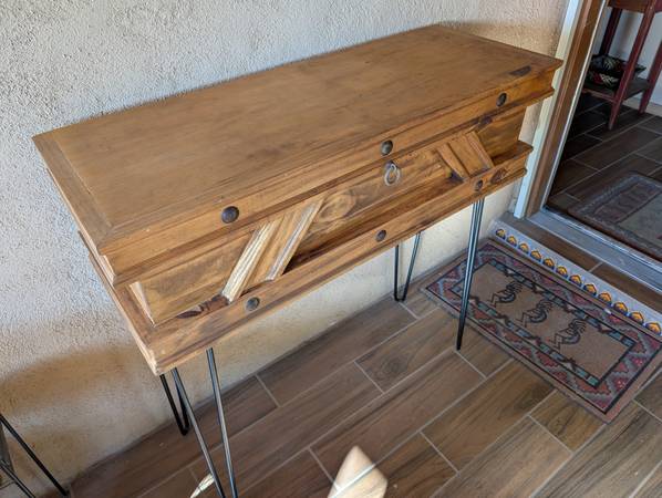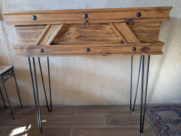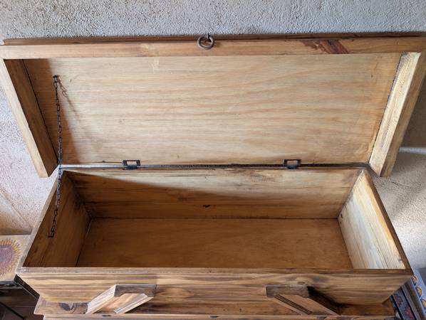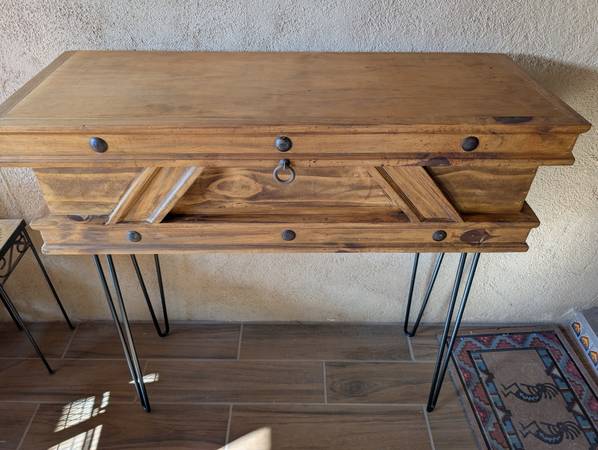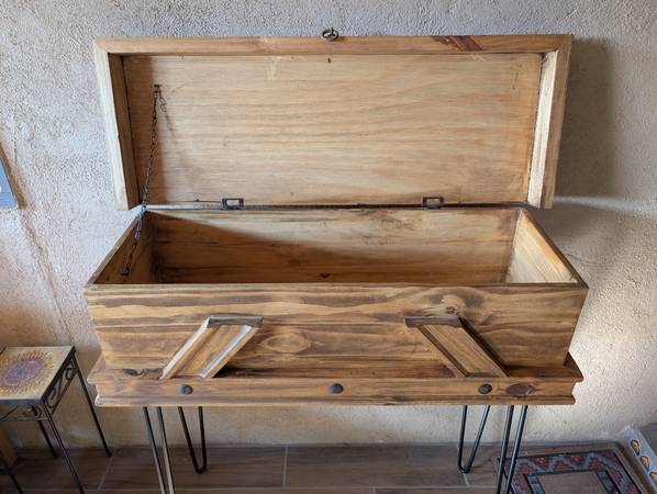 For Sale: Rustic Treasure Chest Table. It measures 39" tall. 39" wide and 14 1/2" deep. It has lots of storage room in box. Just $150.00. Please call or text me at , Cash only No Emails No Codes.
