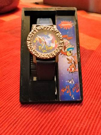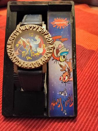 The Ren Stimpy Nickelodeon Watch is a vintage unisex wristwatch with a 35mm silver case and a blue leather two-piece strap. The watch features Arabic numerals, stick indexes, and round indexes on a multicolor dial, powered by a quartz movement. With a classic style and casual appeal, this watch is perfect for everyday wear and showcases the Nickelodeon brand with its unique design. The watch also includes a 12-hour dial and is a must-have for fans of retro pop culture
