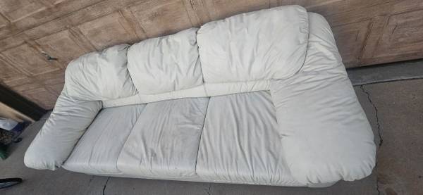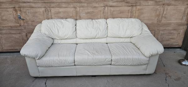 White leather couch in good condition, with no tears. There are some small discoloration spots but overall in great shape and super comfy.
