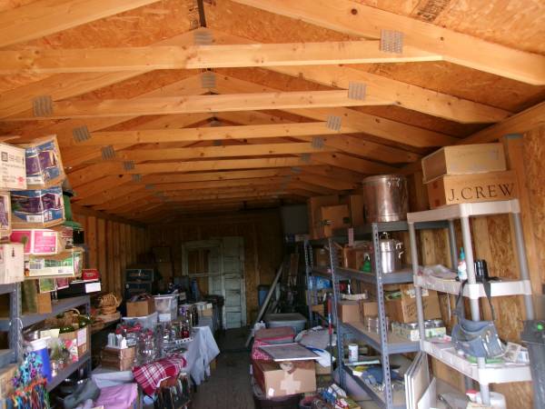 Weather King Storage building with metal roof, 2 windows and exterior door. Very good condition. No leaks in roof, sides and no holes anywhere. Plywood floors. Sits on skids. Currently full - I've been selling the items inside with 2 additional yard sales planned.