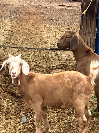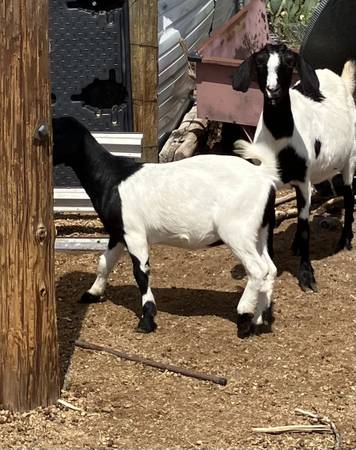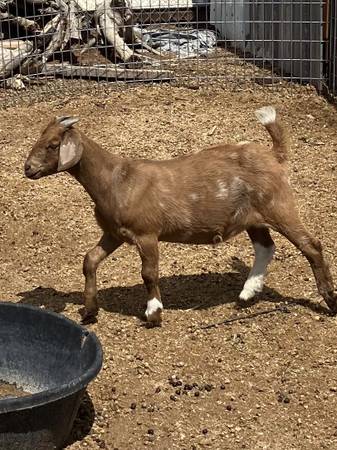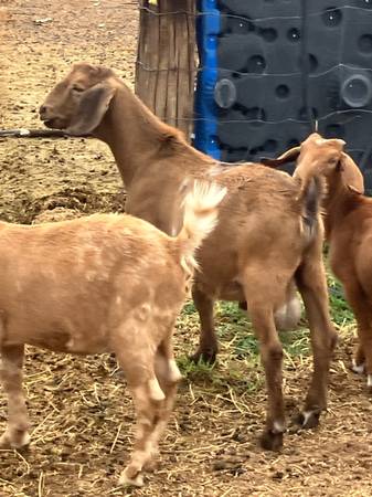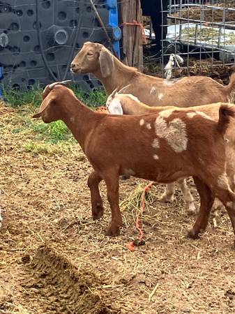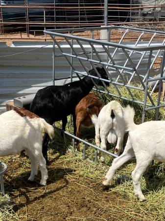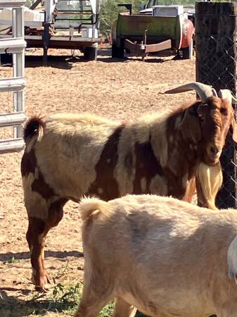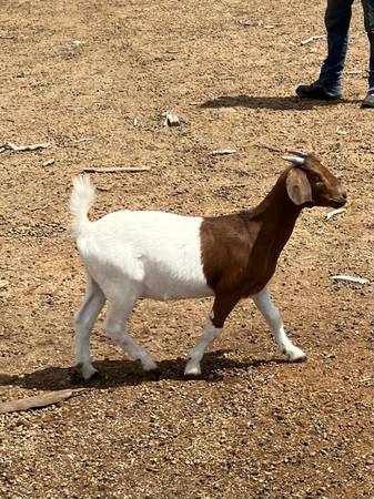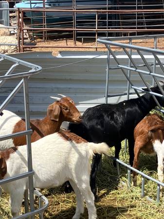 Boer goats for sale. Born earlier this year. Various sizes and ages. All carry dapple genetics. Price ranges between $125 and $200 depending on size and color. The last two pictures are of the Billy goat that is the dad. Please call or text show contact info