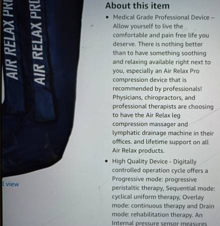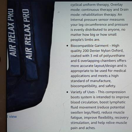 Brand New still in box Air Relax Pro AR-4.0 Leg Recovery Medical System. Greatly reduces leg swelling, pain, fatigue, and recovery times from surgery or daily exercises. Selling for $290.(Amazons...