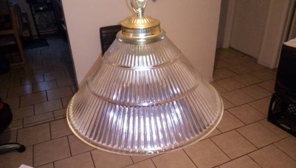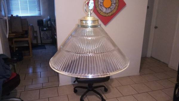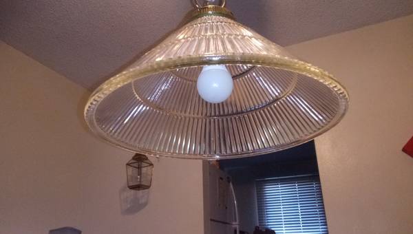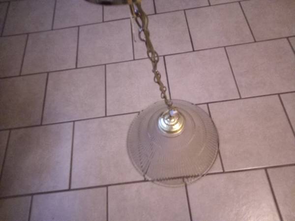 Glass hanging light fixture (THICK HEAVY GLASS). 15 inch diameter. Bottom of fixture hangs 30" from ceiling. Can be wired in place of existing ceiling fixture or a cord can be run across ceiling and down wall to power outlet. (HANG IT ANYWHERE) Lamp cord has white inline switch. See photo.