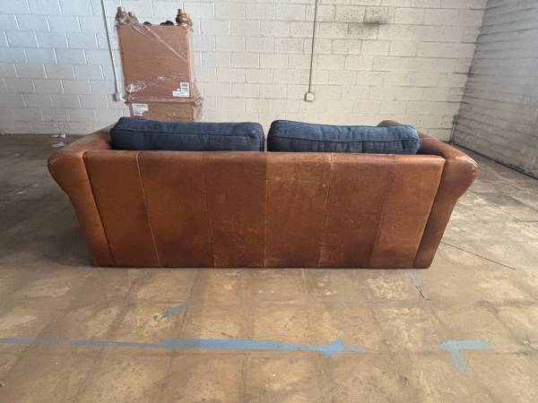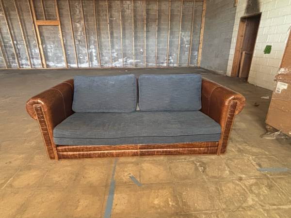Beautiful and durable Legacy Leather two-seat sofa featuring rich genuine leather with a crocodile-embossed texture and dark blue fabric cushions. Classic rolled arms, brass nailhead trim, and solid construction make this a standout, high-end piece thatβs built to last.